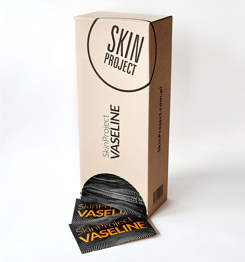 SkinProject VASELINE, podajnik z saszetkami 7 g – wazelina biała jakości farmaceutycznej stosowana do profesjonalnego zabezpieczenia tatuażu oraz wzoru w trakcie zabiegu tatuowania.